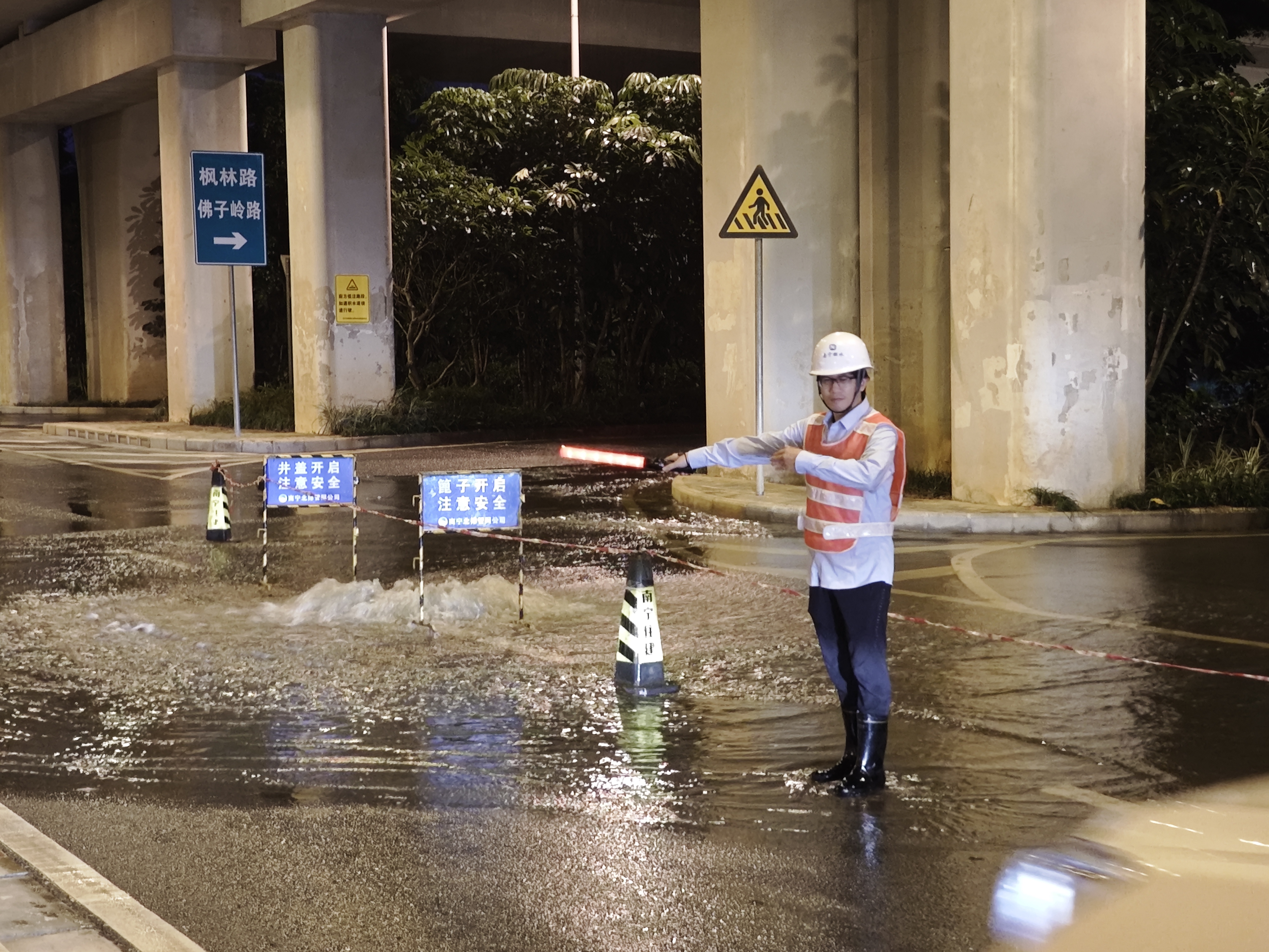 市排水公司工作人員在鳳嶺北路楓林路口引導(dǎo)車輛有序通行