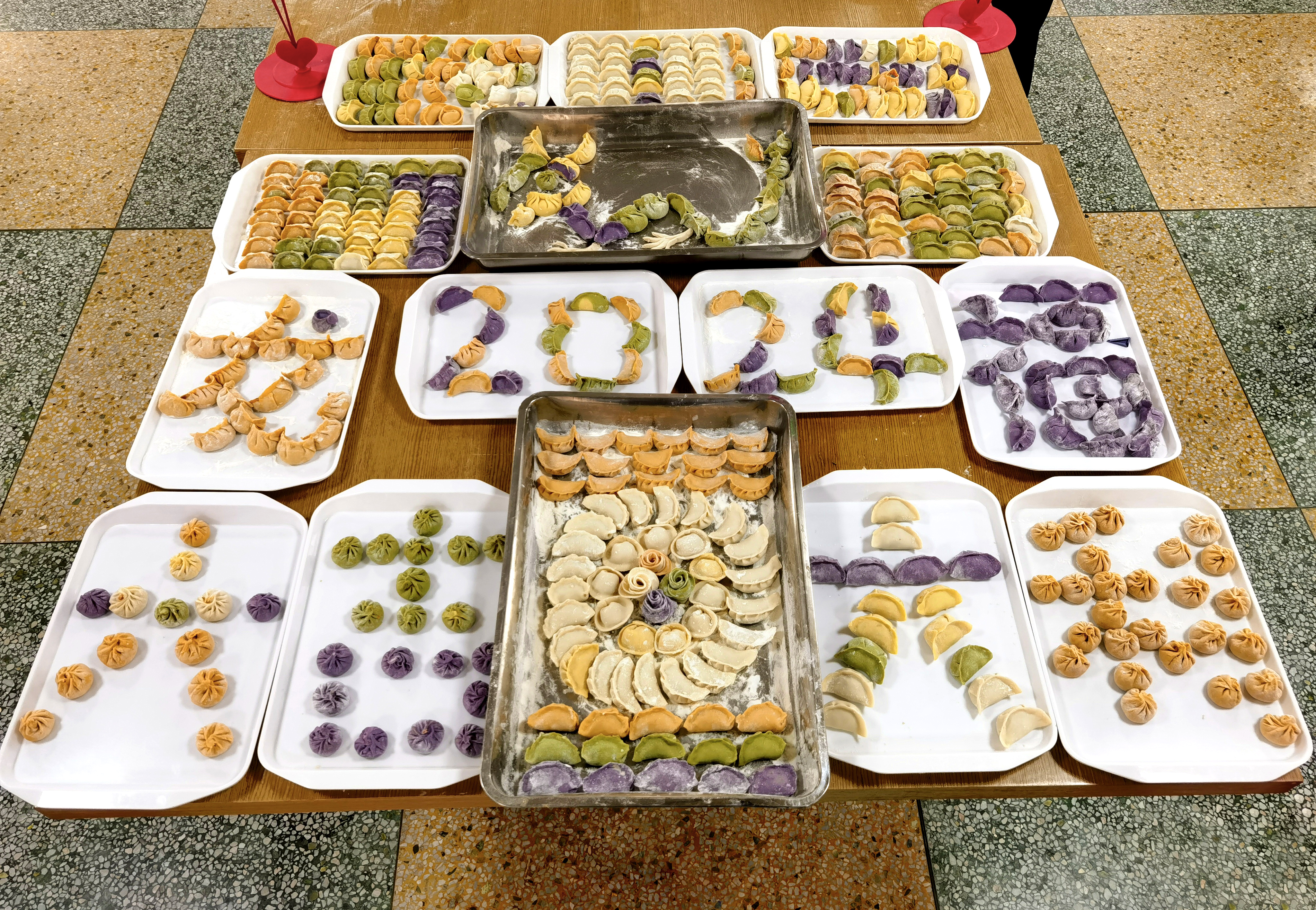 在大家的巧手下,一個個款式多樣、五顏六色的餃子逐漸成形,裝滿了一個又一個托盤,有傳統(tǒng)手藝的餃子,也有創(chuàng)意包法的元寶型、花型餃子等,形態(tài)不一、各具特色,大家還用餃子擺成各種象征美好寓意的造型,讓人目不暇接。